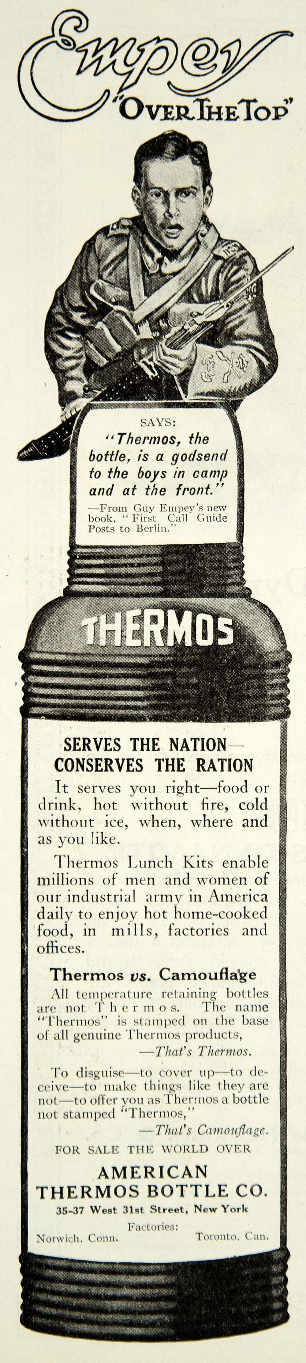 This is an original 1918 black and white print ad for the Thermos by the American Thermos Bottle Co. of New York featuring a quote by Guy Empey stating, "Thermos, the bottle, is a godsend to the boys in camp and at the front."