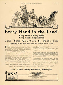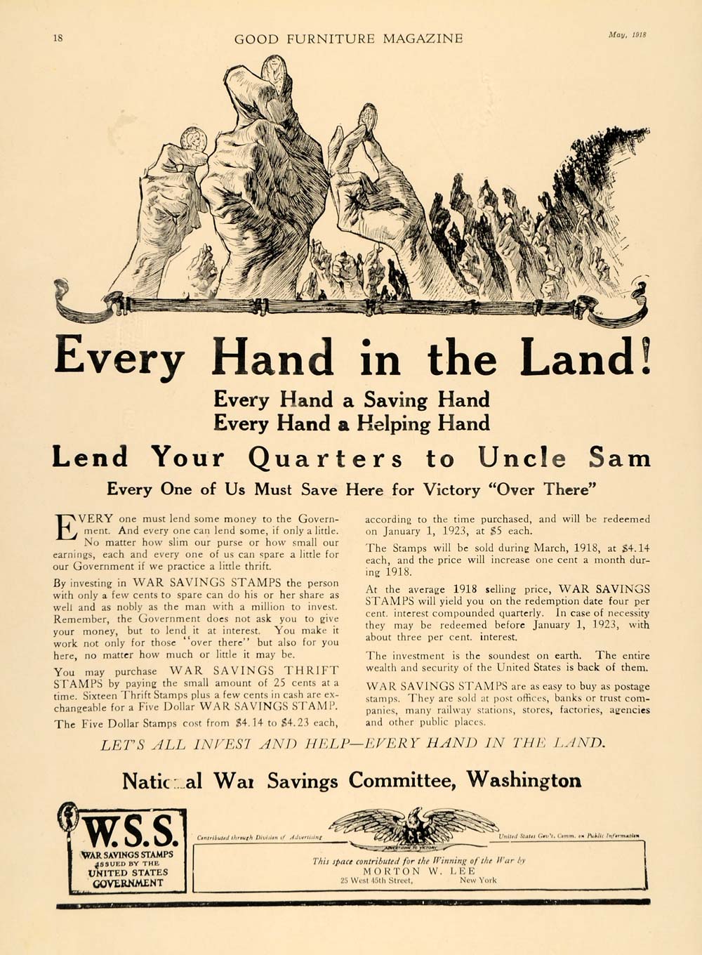 This is an original 1918 black and white print ad for the National War Savings Committee of Washington, whose ad space was paid for by Morton W. Lee (25 West 45th Street in New York). This ad is for War Savings Stamps issued by the United States Government to aid in the country's victory in World War I. This ad features artwork by an unknown artist, only distinguishable by the artist signature in the bottom right of the illustration as "T. R.".