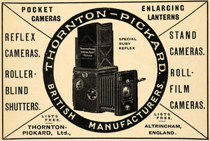 This is an original 1918 black and white print ad from Thornton-Pickard, Ltd. of Altrincham, England offering pocket cameras, reflex cameras, stand cameras, roll-film cameras, roller-blind shutters, and enlarging lanterns. Pictured here is the Thornton-Pickard Special Ruby Reflex Camera.