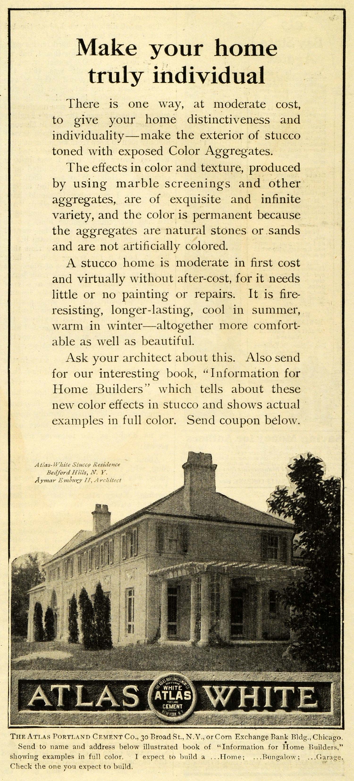 This is an original 1918 black and white print ad for the Atlas Portland Cement Company located at 30 Broad Street, New York. This ad also features an image of the Atlas-White Stucco Residence in Bedford Hills, New York. Architect: Aymar Embury II.