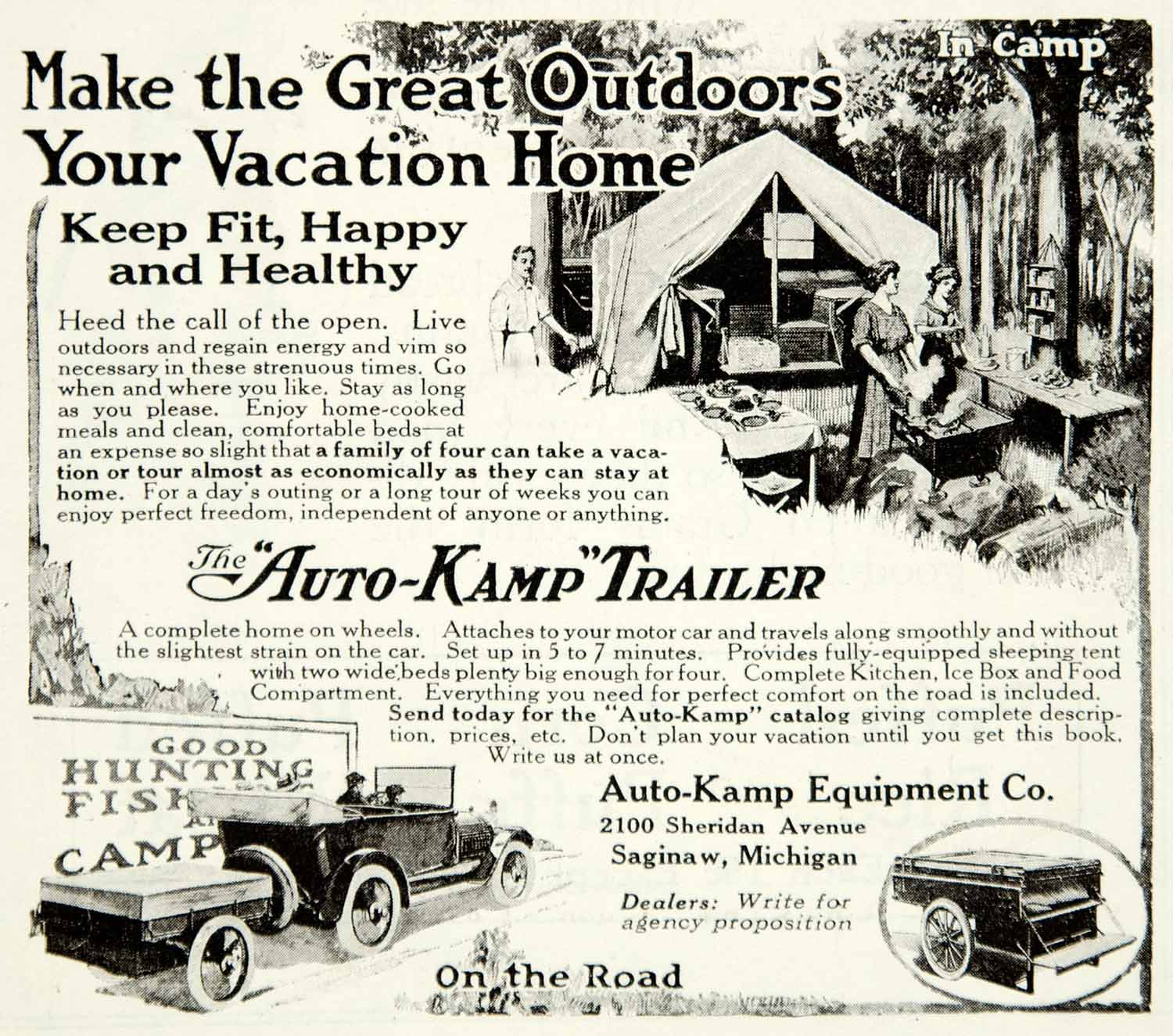 This is an original 1918 black and white print ad for the Auto-Kamp trailer from the Auto-Kamp Equipment Co. of Saginaw, Michigan.