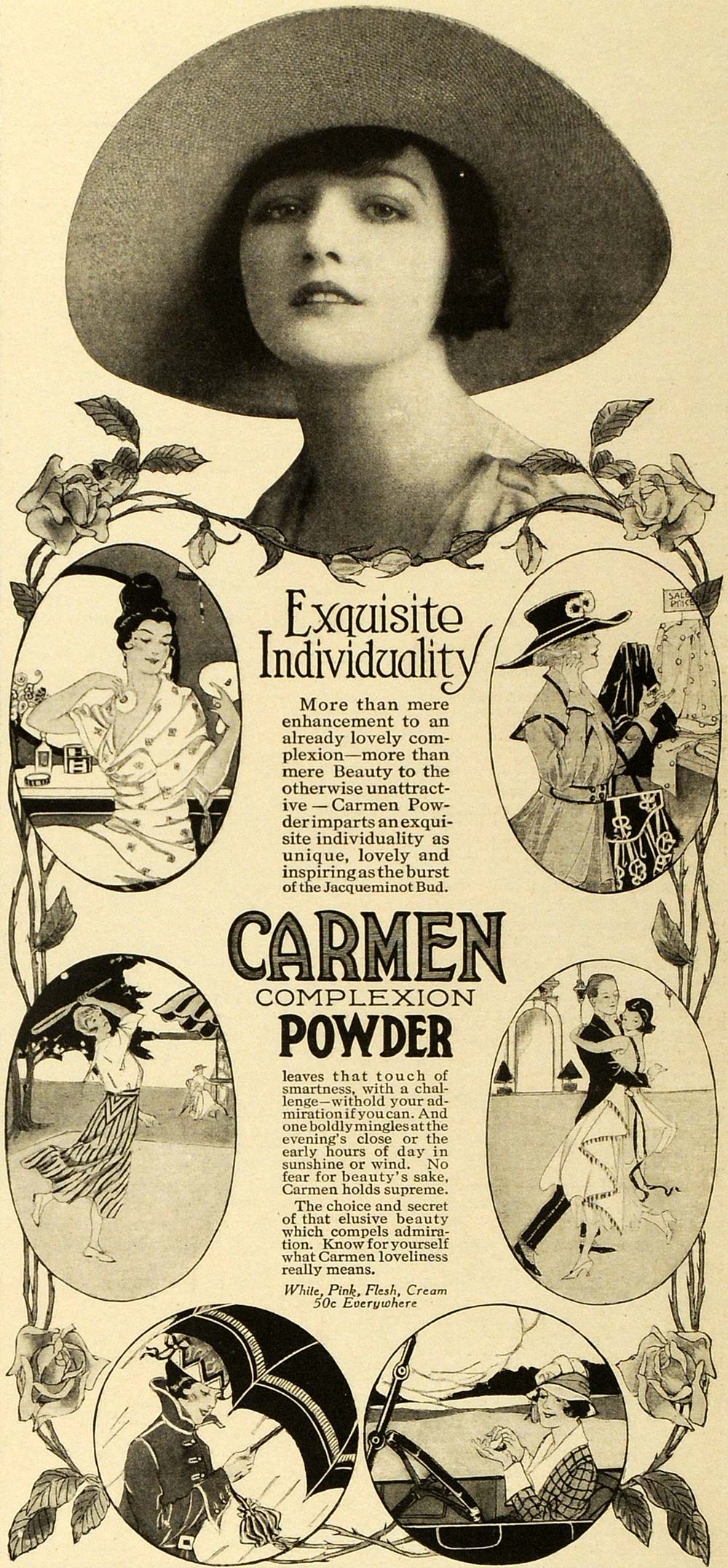 This is an original 1918 black and white print ad for Carmen Complexion Powder.