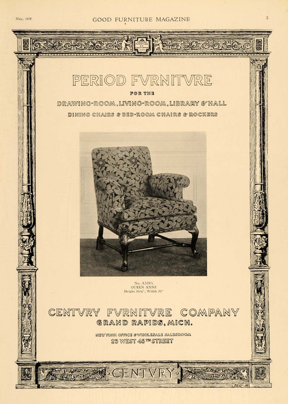 This is an original 1918 black and white print ad for the Century Furniture Company, located in Grand Rapids, Michigan, with a showroom located at 25 West 45th Street in New York. This ad features their Period Furniture for the drawing room, living room, library and hall; the image is of their Queen Anne design armchair.