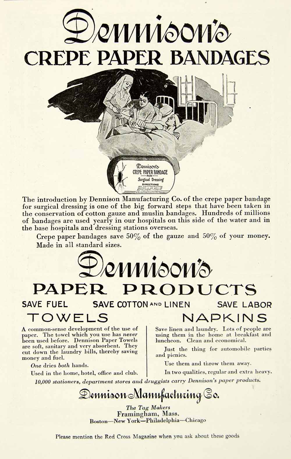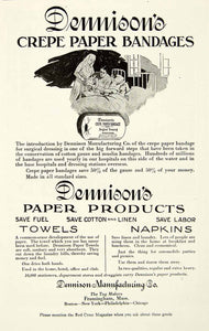 This is an original 1918 black and white print ad for Dennison Manufacturing Co.'s Crepe Paper bandages, towels, and napkins for use in hospitals and households during World War I.