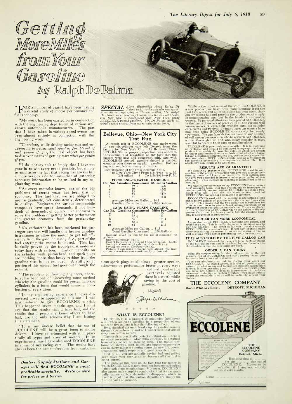 This is an original 1918 black and white print ad for Eccolene by the Eccolene Company of Detroit, Michigan.