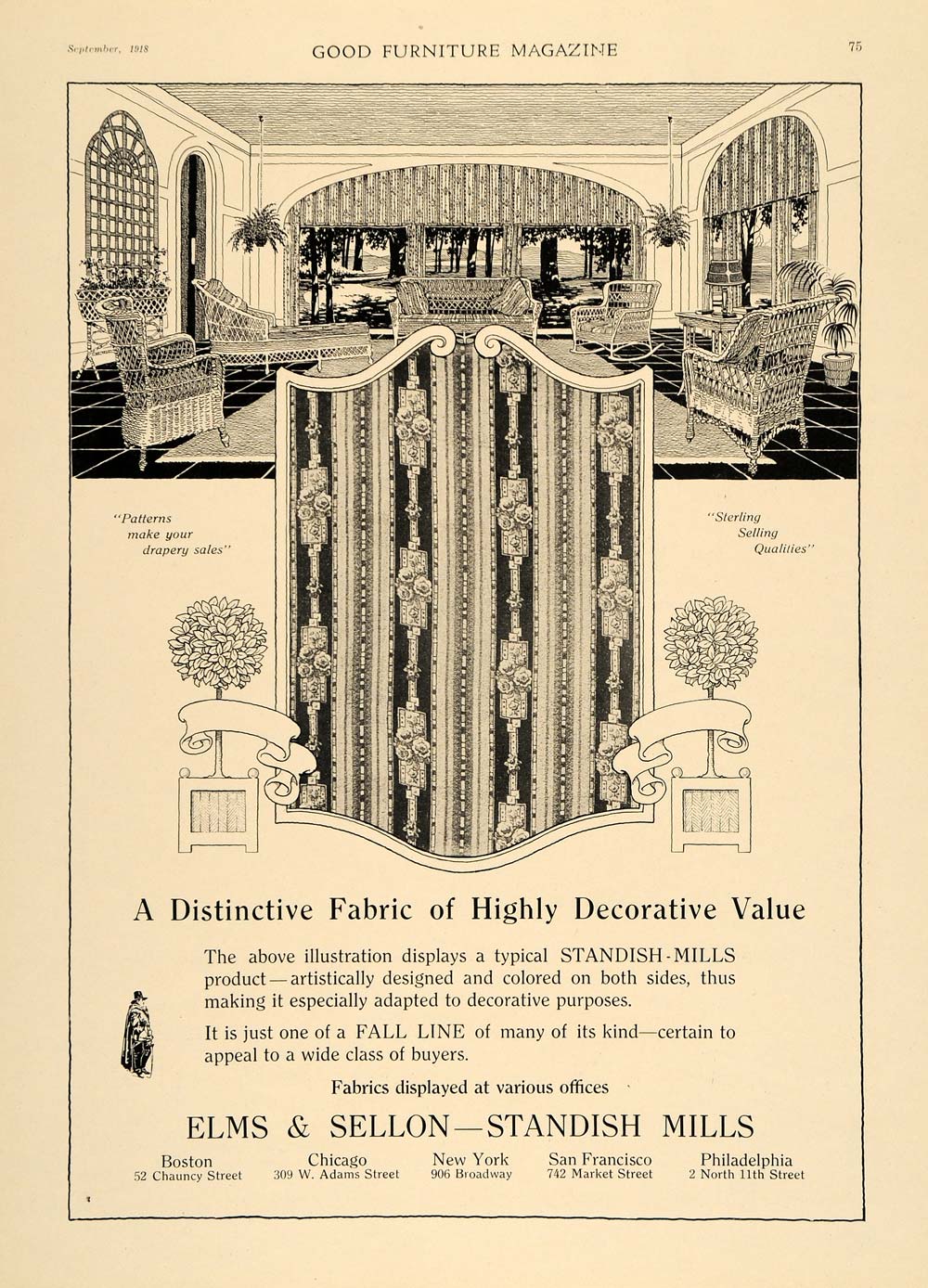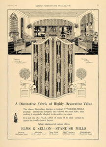 This is an original 1918 black and white print ad for decorative fabrics by Elms and Sellon - Standish Mills. Locations: 52 Chauncy Street, Boston; 309 W. Adams Street, Chicago; 906 Broadway, New York City; 742 Market Street, San Francisco; 2 North 11th Street, Philadelphia.
