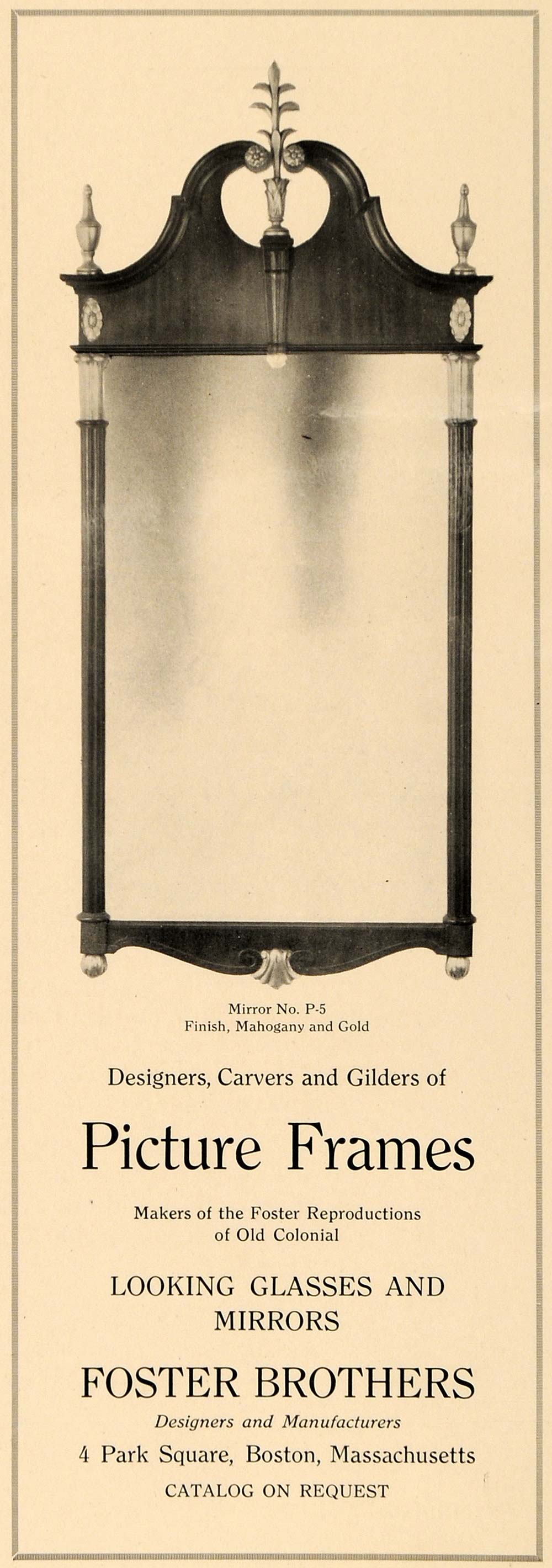 This is an original 1918 black and white print ad for Foster Brothers' Picture Frames, Looking Glasses and Mirror.