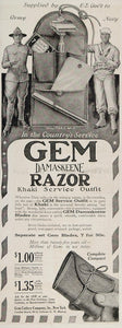 This is an original 1918 black and white print ad for the Gem Razor Khaki Service Outfit with Gem Damaskeene Blades from the Gem Cutlery Company. The ad has a very nice illustration of the Military No. 7 kit with a World War I American Army soldier and Navy sailor.