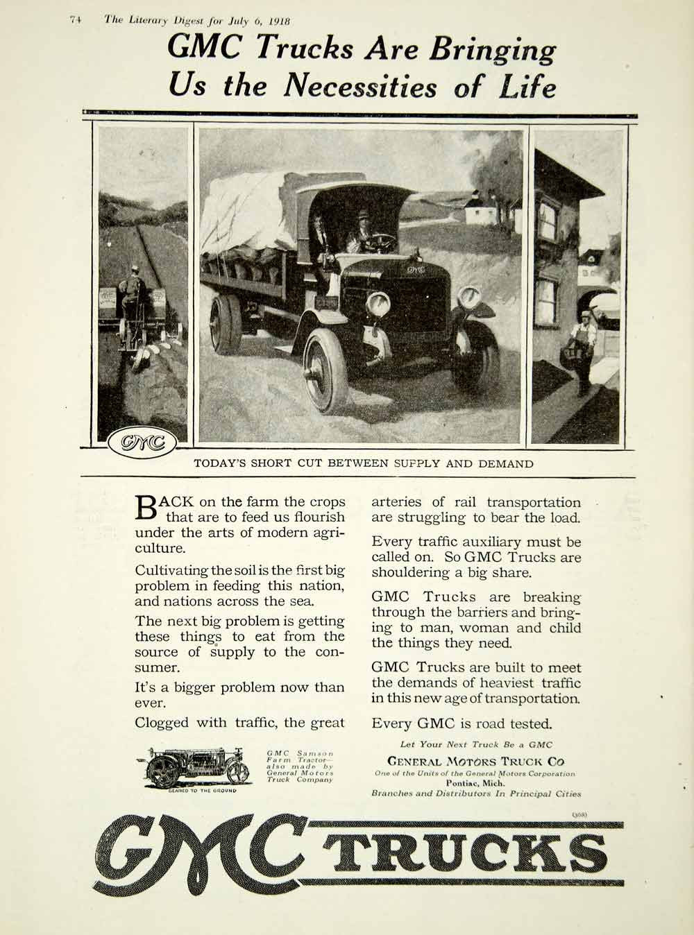 This is an original 1918 black and white print ad for trucks by the General Motors Truck Company of Pontiac, MI with a small mention about their Samson Farm Tractors, as well.