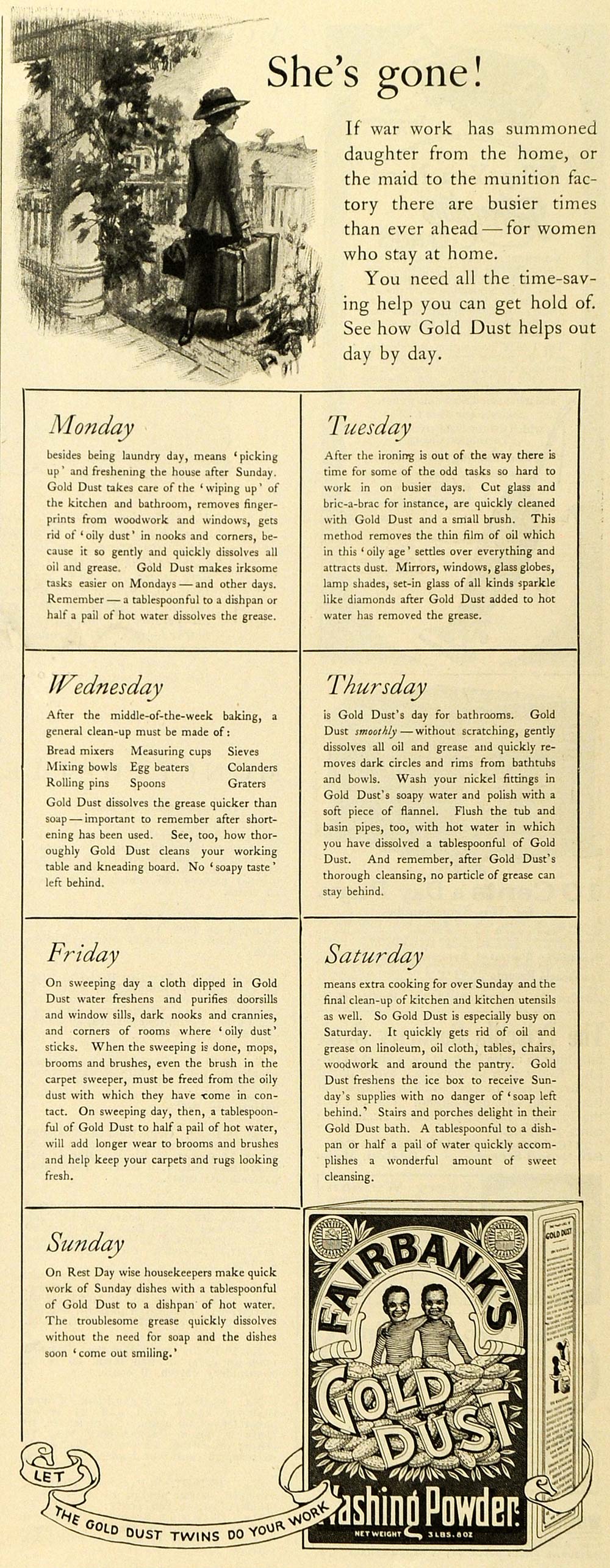 This is an original 1918 black and white print ad for the Fairbank's Gold Dust Washing Powder from N. K. Fairbank Corporation.