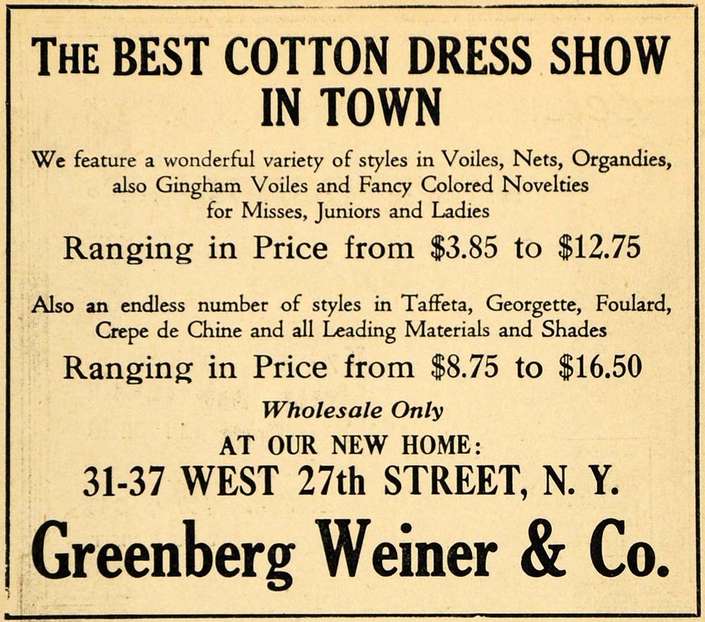 This is an original 1918 black and white print ad for Greenberg Weiner and Company. The ad writes, "We feature a wonderful variety of styles in Voiles, Nets, Organdies, also Gingham Voiles and Fancy Colored Novelties for Misses, Juniors and Ladies." The clothing was priced from $3.85 to $12.75.
