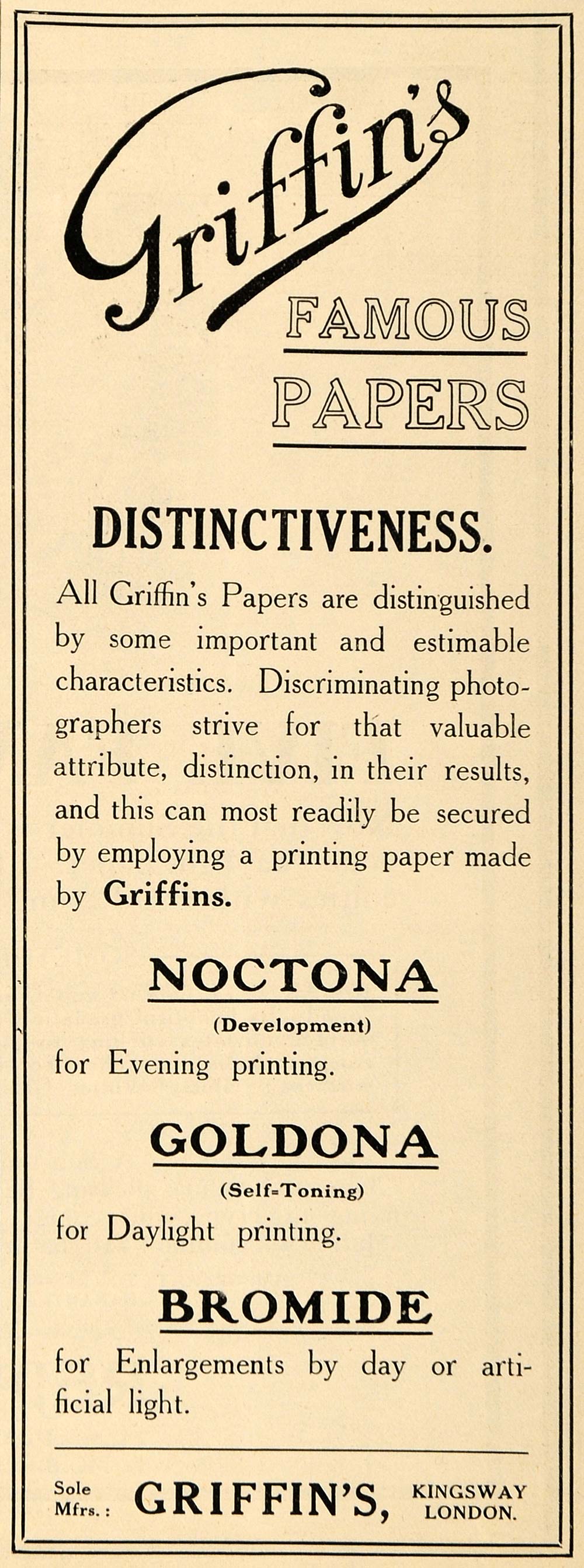 This is an original 1918 black and white print ad for Griffin's Noctona, Goldona, and Bromide Papers for photographers, from Griffin's, Kingsway, London.