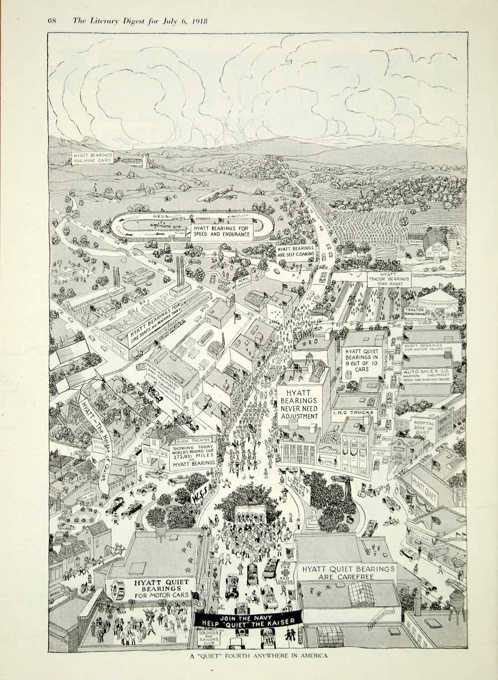 This is an original 1918 black and white print ad for Hyatt Quiet Bearings for cars featuring the streets of a city flooded with people, cars, and signs advertising Hyatt Bearings, Liberty Bonds, Red Cross, and a banner that reads, "Join the Navy. Help quiet the Kaiser."