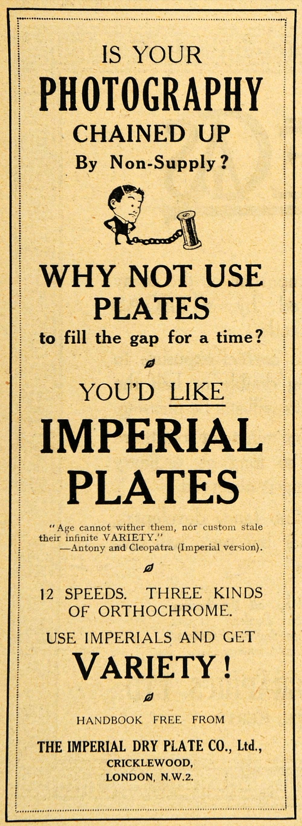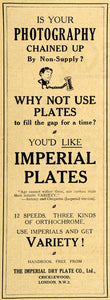 This is an original 1918 black and white WWI-era print ad for Imperial Plates for photography from The Imperial Dry Plate Co., Ltd. Cricklewood, London, England.