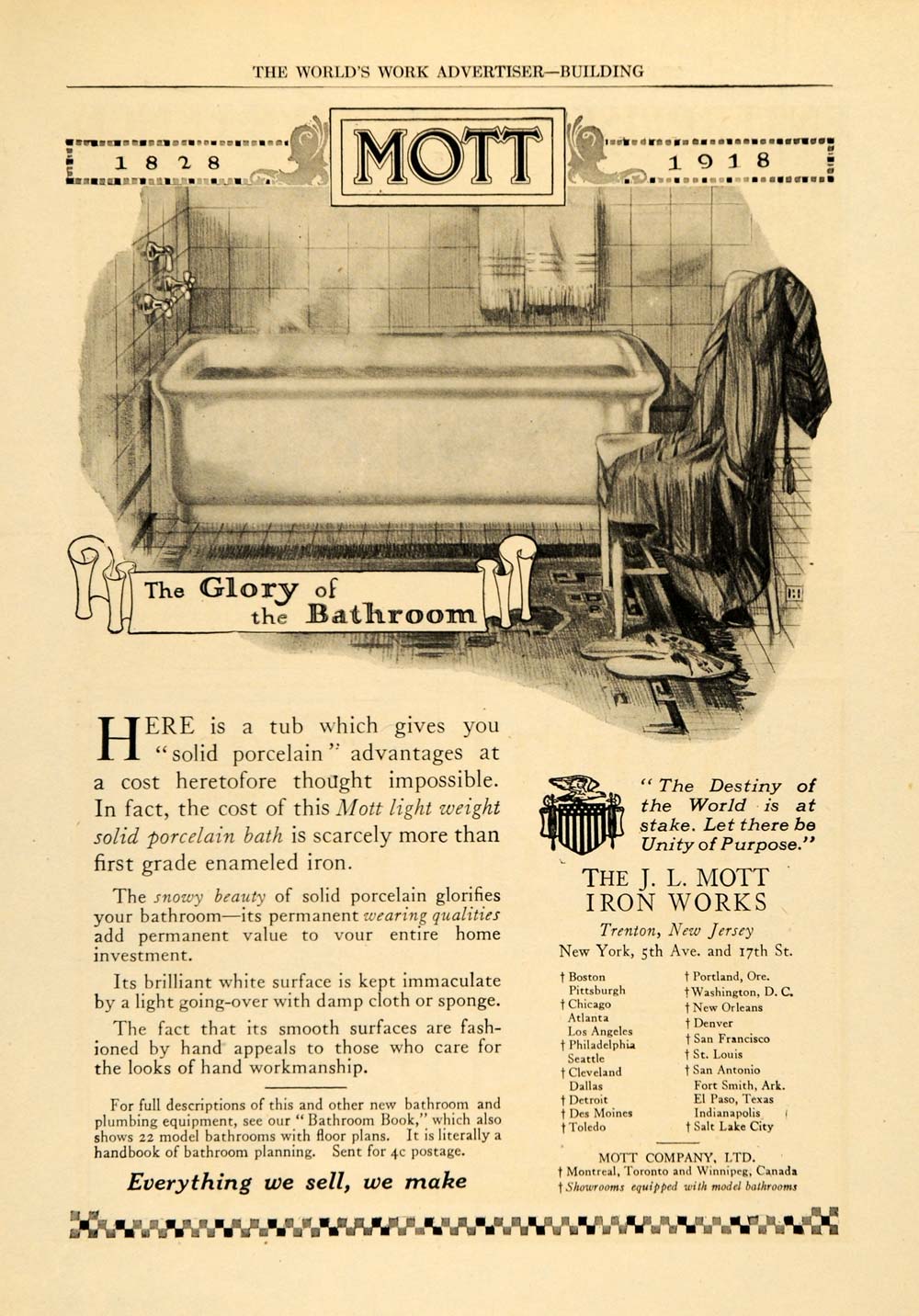 This is an original 1918 black and white print ad for the J. L. Mott Iron Works Company in Trenton, New Jersey, specially featuring the company's solid porcelain bath.