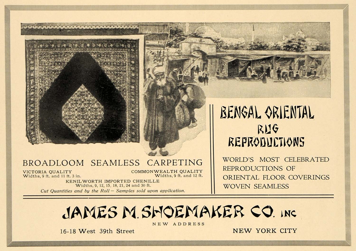 This is an original 1918 black and white print ad for the Bengal Oriental Rug Reproductions from James M. Shoemaker Company, Incorporation located at 16-18 West 39th Street, New York.