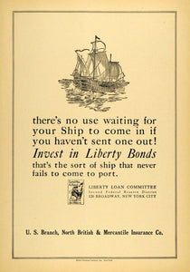 This is an original World War I 1918 black and white print ad for Liberty Bonds, a product by the U. S. Branch, North British & Mercantile Insurance Company.