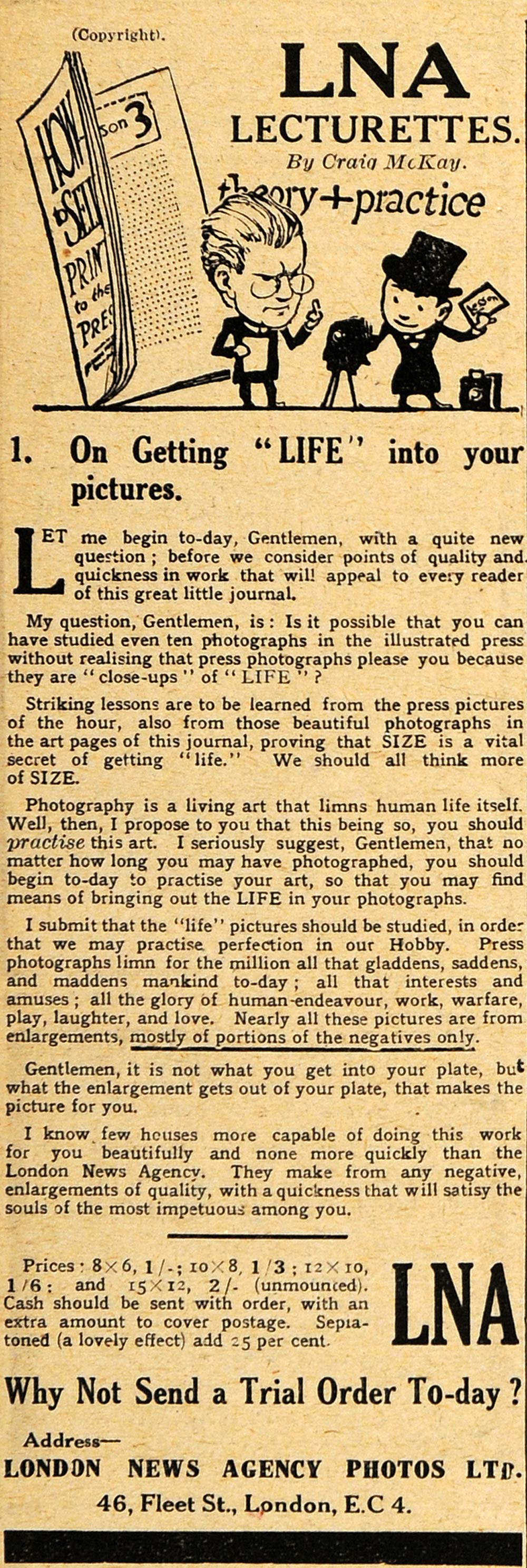 This is an original 1918 black and white print ad for London News Agency Photos, Ltd., 46 Fleet Street, London with a tip on getting better photographs from Craig McKay.