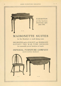 This is an original 1918 black and white print ad for Maisonette Suites furniture for the breakfast or small dining room by the Imperial Furniture Company located in Grand Rapids, Michigan. This ad shows a small buffet table or sideboard (No. 1698), chair (No. 9c) and a folding table (No. 1697).