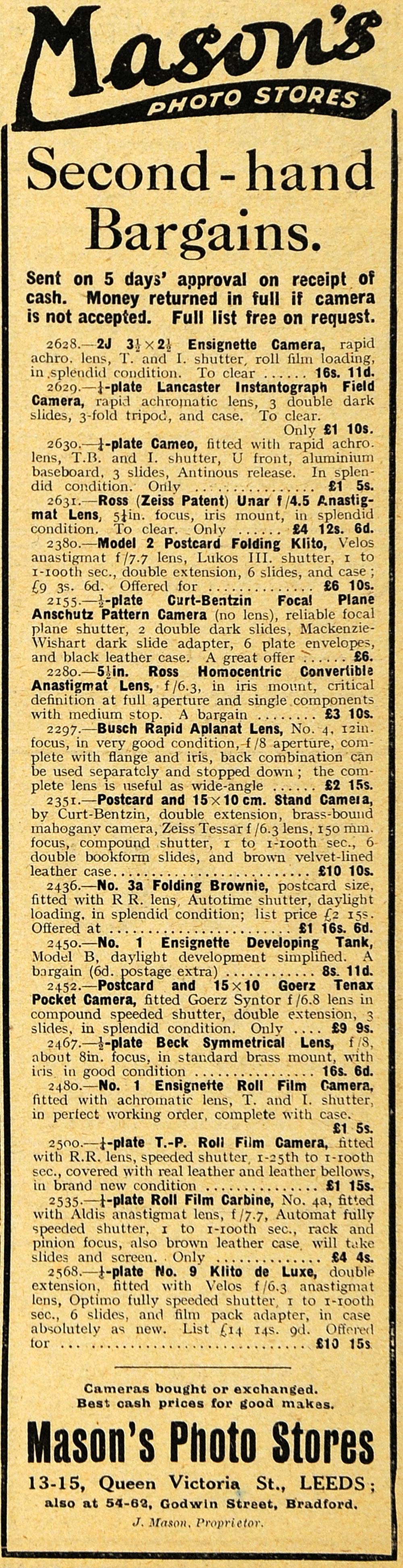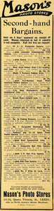 This is an original 1918 black and white print ad for Mason's Photo Stores at 13-15 Queen Victoria Street, Leeds and 54-62 Godwin Street, Bradford, England-- dealers in second-hand cameras and photographic equipment.