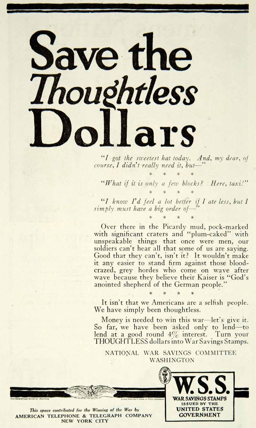This is an original 1918 black and white print ad for War Savings Stamps by the National War Savings Committee in Washington. Ad space available through the American Telephone & Telegraph Company of NYC.