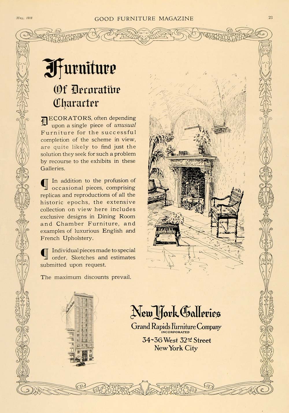 This is an original 1918 black and white print ad for the New York Galleries of the Grand Rapids Furniture Company, Incorporated, located at 34 - 36 West 32nd Street in New York City.