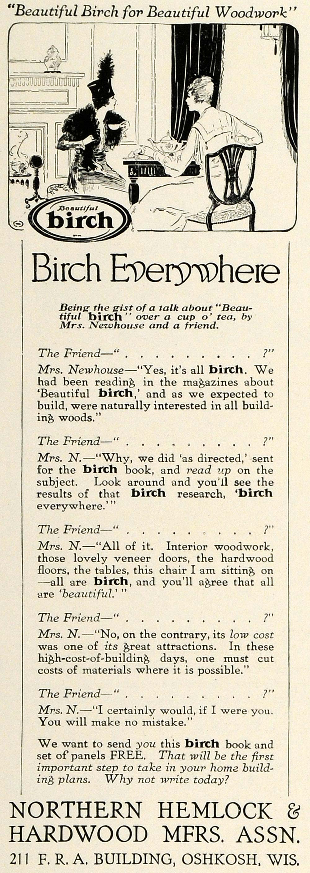 This is a small original 1918 black and white print ad for the Northern Hemlock and Hardwood Manufacturers Association in Oshkosh, Wisconsin.