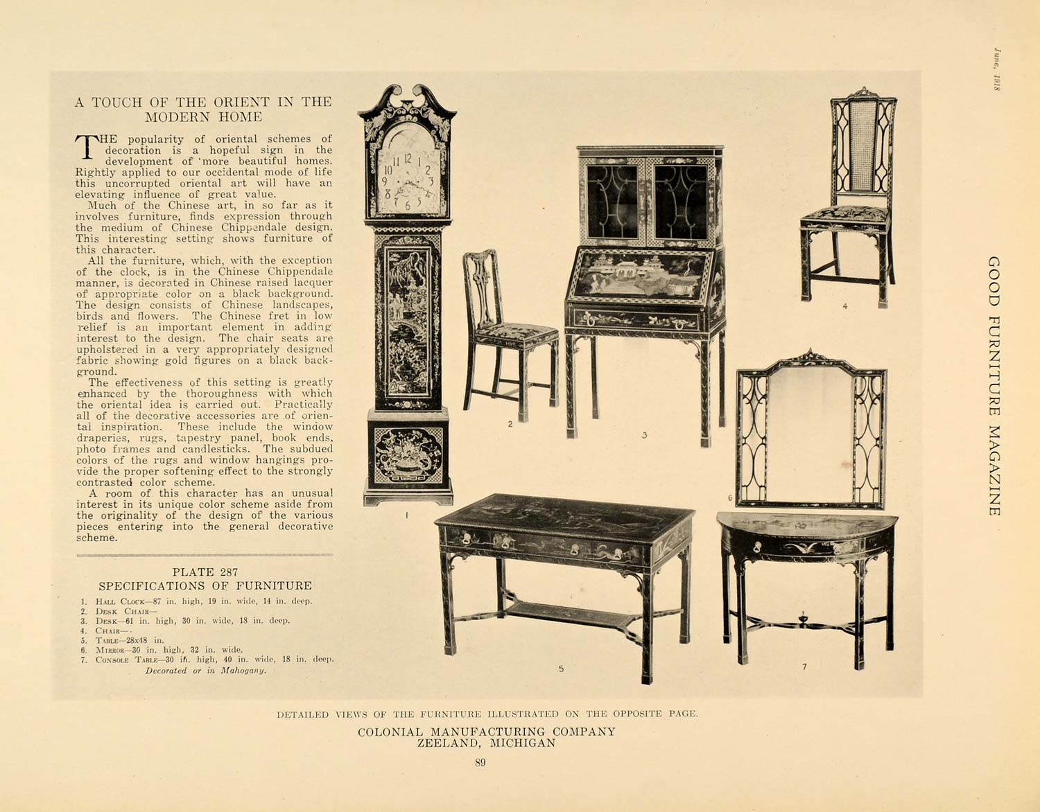 This is an original 1918 black and white print ad for Chinese Chippendale style furniture by the Colonial Manufacturing Company located in Zeeland, Michigan. This as shows pictures of a hall clock, desk chair, desk, chair, table, mirror and console table.