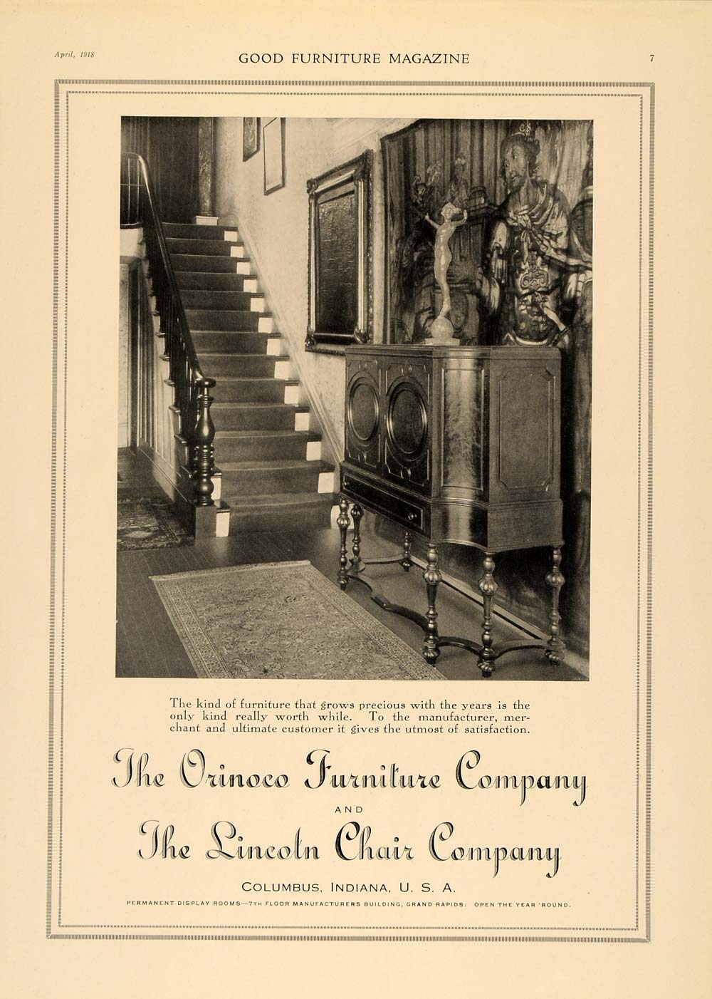 This is an original 1918 black and white print ad for furniture by The Orinoco Furniture Company and The Lincoln Chair Company located in Columbus, Indiana.