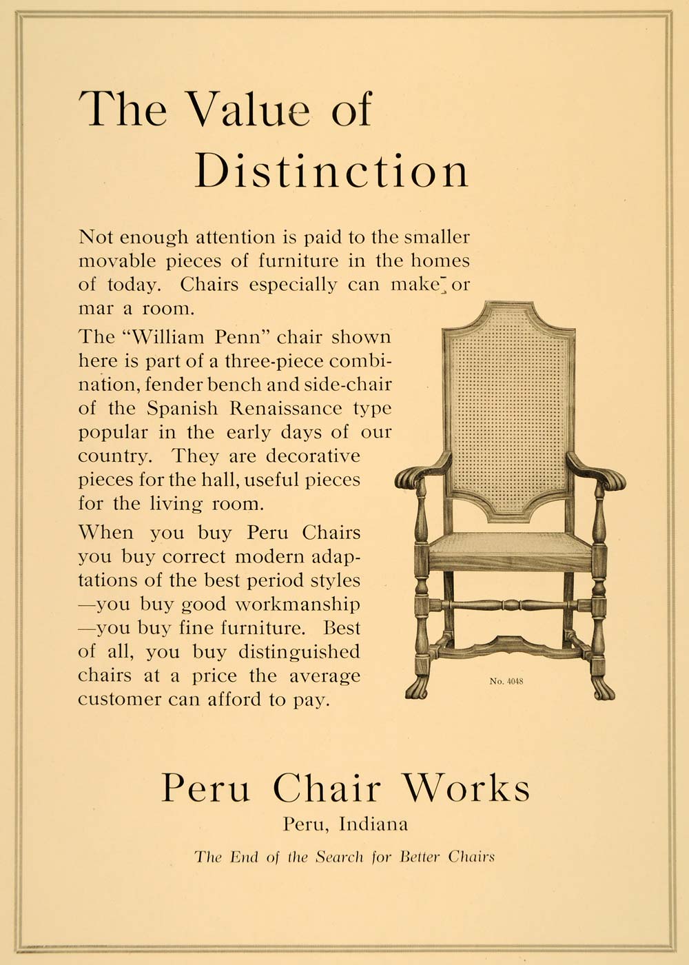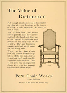 This is an original 1918 black and white print ad for the "William Penn" chair (No. 4048) it is part of a three piece combination, fender bench and side chair of the Spanish Renaissance by Peru Chair Works located in Peru, Indiana.
