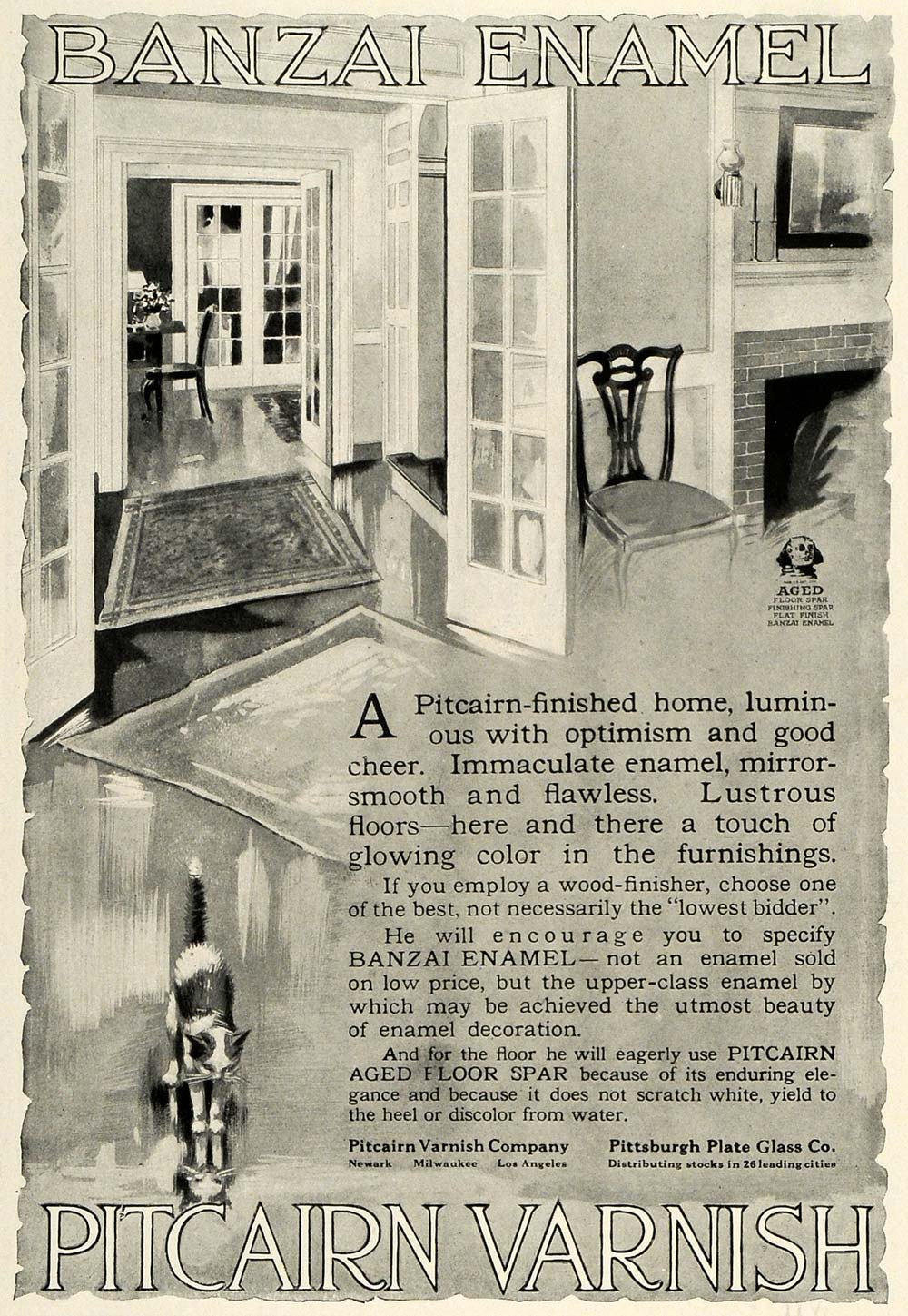 This is an original 1918 black and white print ad for the Pitcairn Varnish Company and Pittsburgh Plate Glass Company, featuring Banzai Enamel and Pitcairn Aged Floor Spar.