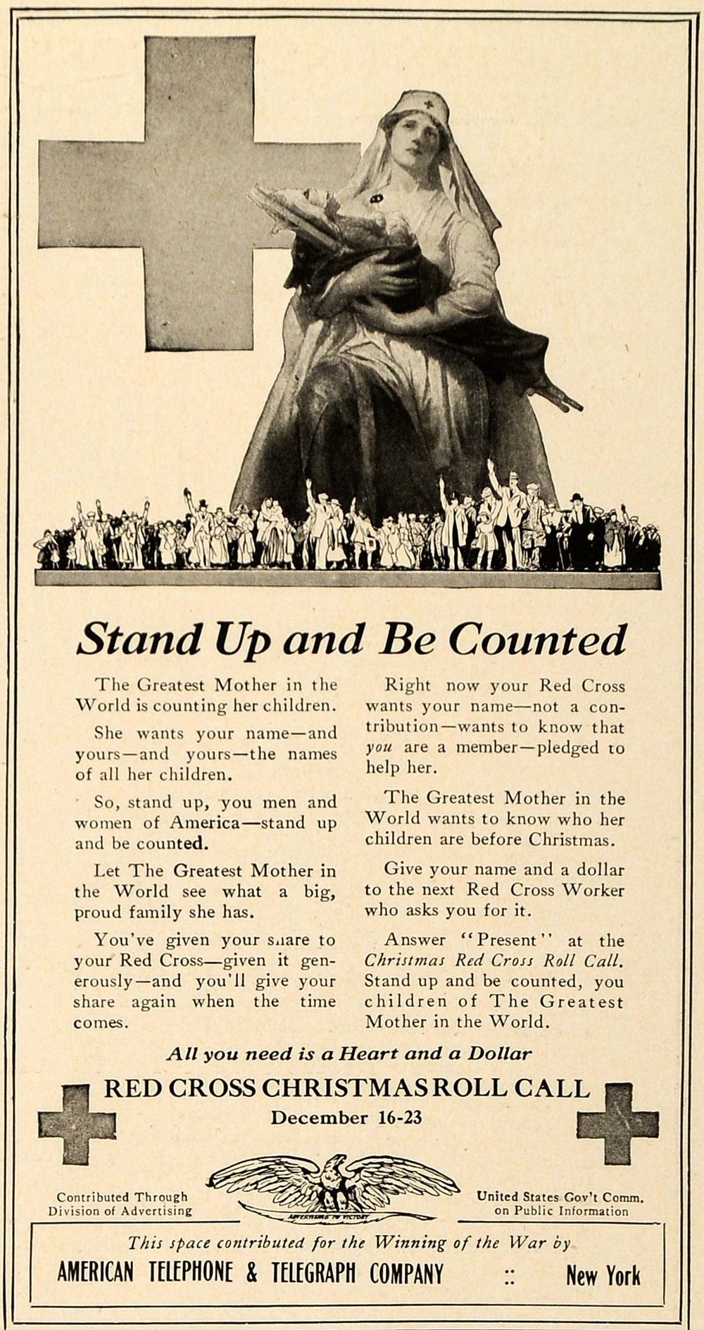This is an original 1918 black and white print ad for the Red Cross Christmas Roll Call, sponsored by the American Telephone and Telegraph Company in New York.