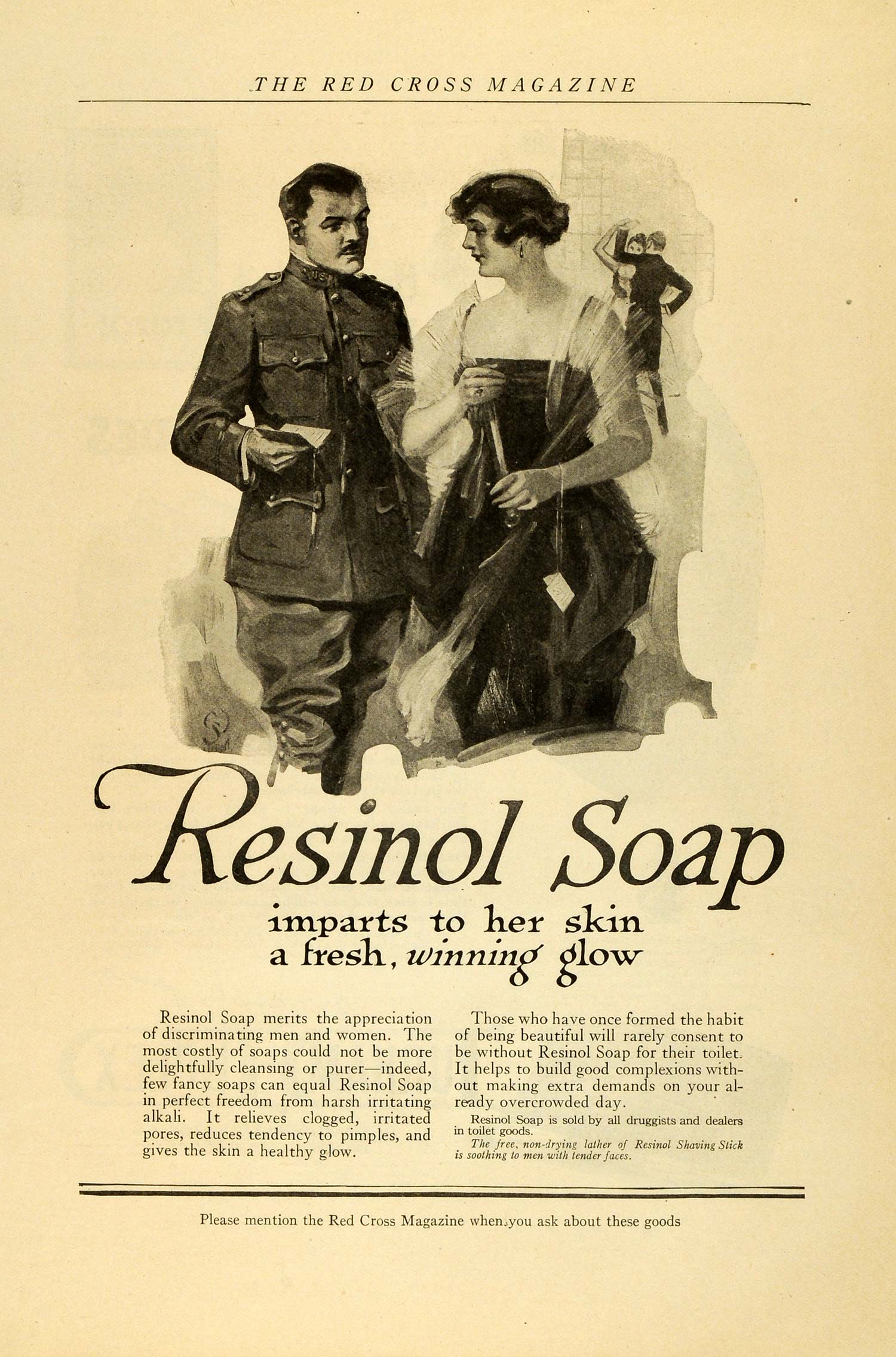 This is an original 1918 black and white print ad for Resinol Soap, imparts to her skin a fresh, winning glow.