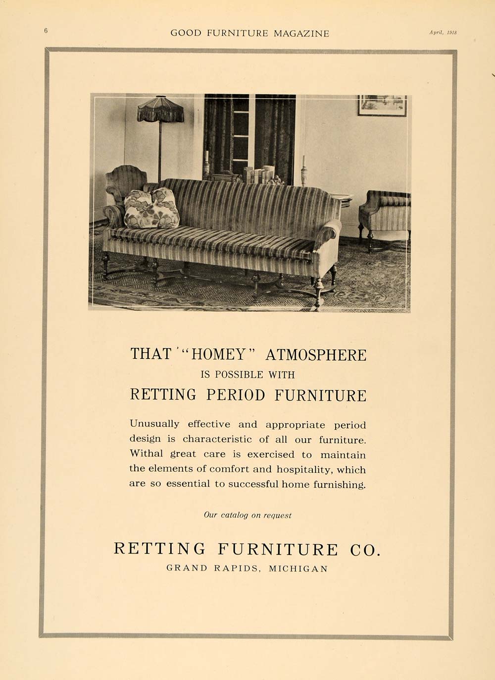 This is an original 1918 black and white print ad for Retting Period Furniture by the Retting Furniture Company located in Grand Rapids, Michigan.