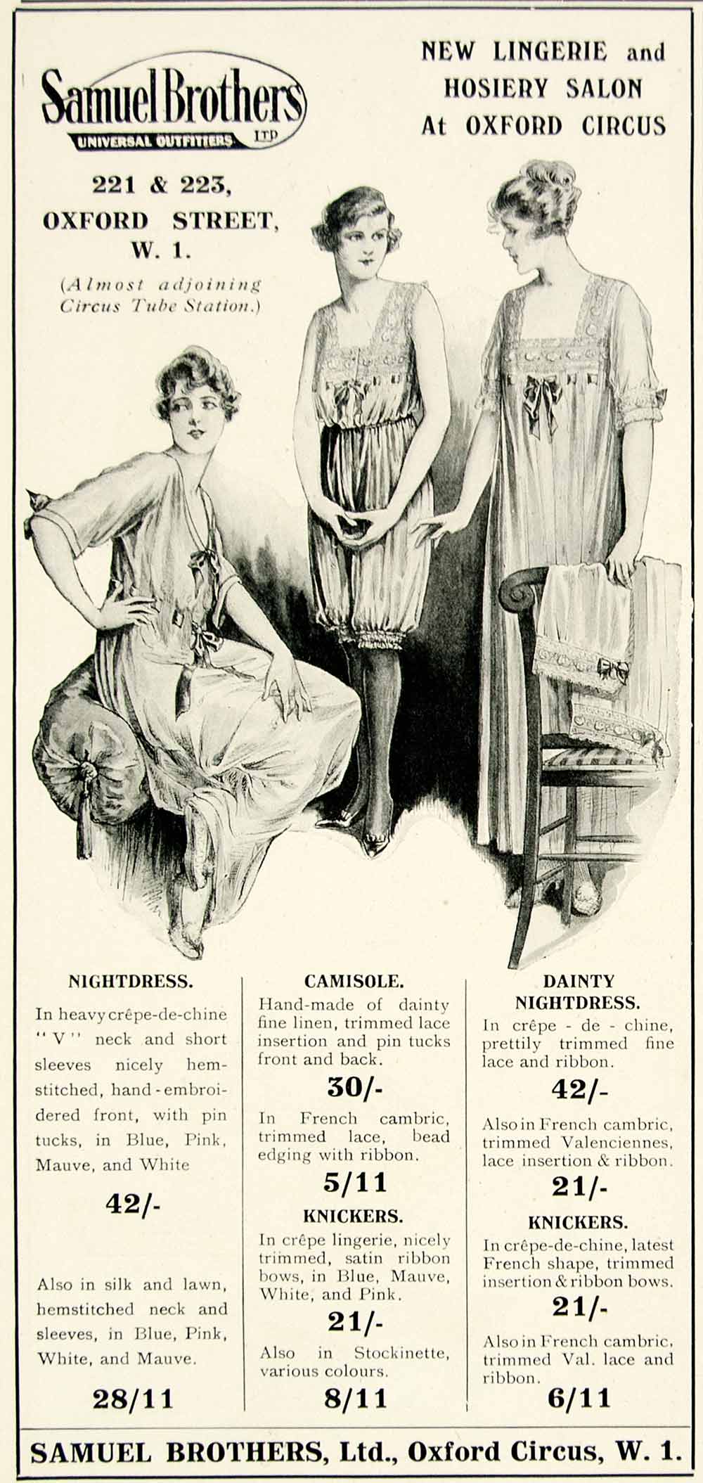 This is an original 1918 black and white print ad for Samuel Brothers Lingerie and Hosiery Salon at Oxford Circus.