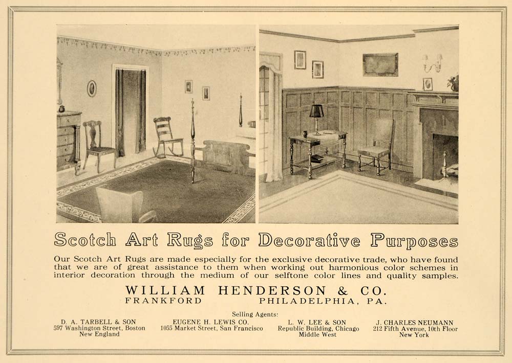 This is an original 1918 black and white print ad for Scotch Art Rugs by William Henderson and Company located in Frankford and Philadelphia, Pennsylvania.