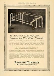 This is an original 1918 black and white print ad for the Simmons Company of Kenosha, Wisconsin. This ad features their beds and bed frames in a time of necessity due to war.