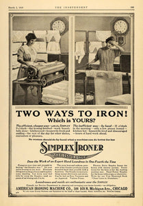 This is an original 1918 black and white print ad for the Simplex Ironer by the American Ironing Machine Company located at 508 168 North Michigan Avenue, Chicago.
