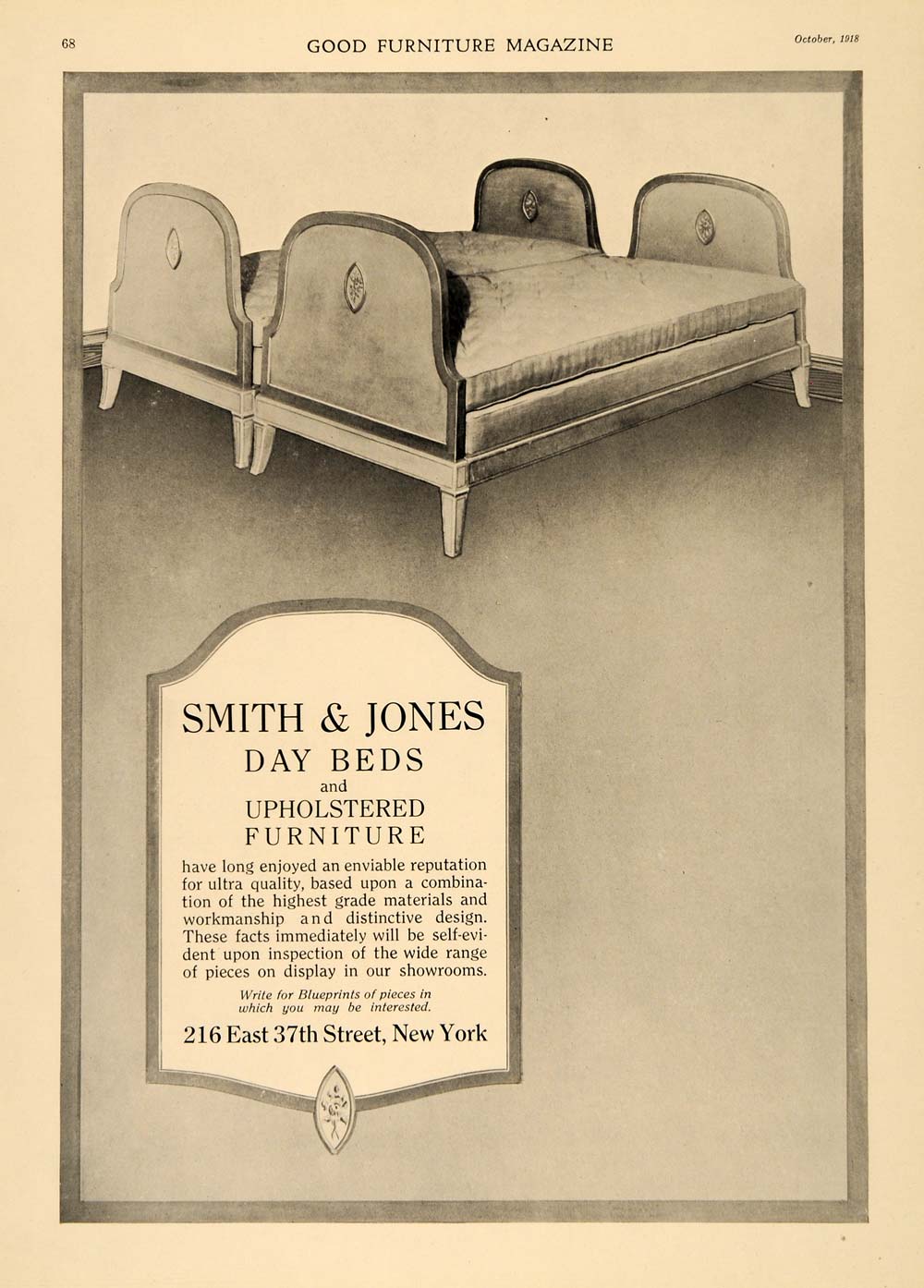 This is an original 1918 black and white print ad for Smith and Jones Day Beds and Upholstered Furniture.