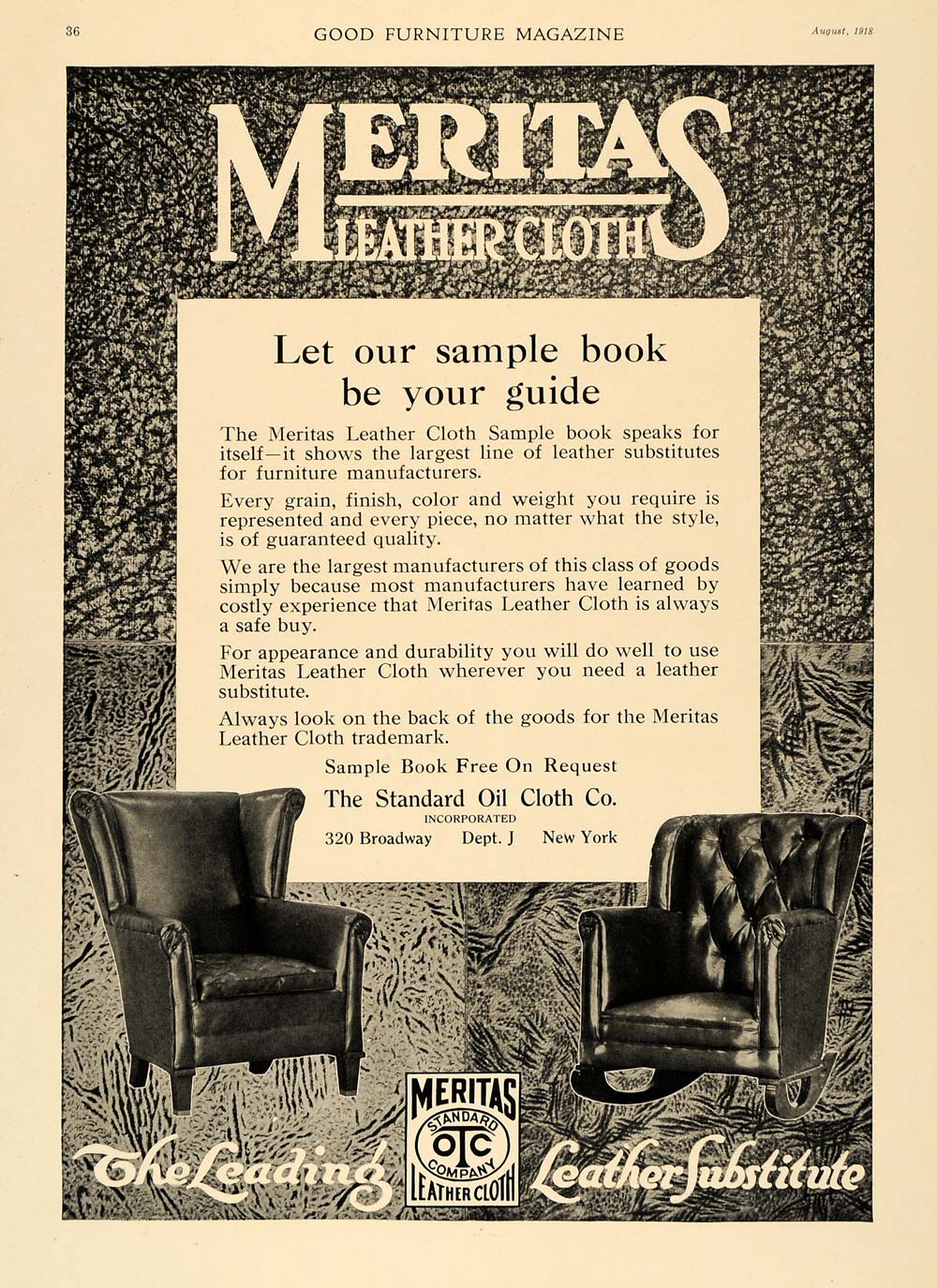 This is an original 1918 black and white print ad promoting the Meritas Leather Cloth materials from Standard Oil Cloth Company, Incorporated located at 320 Broadway, New York.