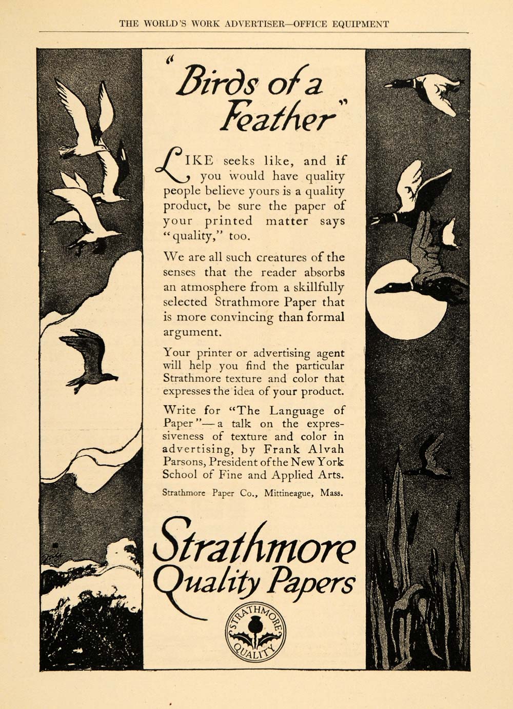 Keywords specific to this image: Birds of a Feather, Ducks, Duck Hunting, Mittineague Massachusetts, New York School of Fine and Applied Arts Vintage Advertising
