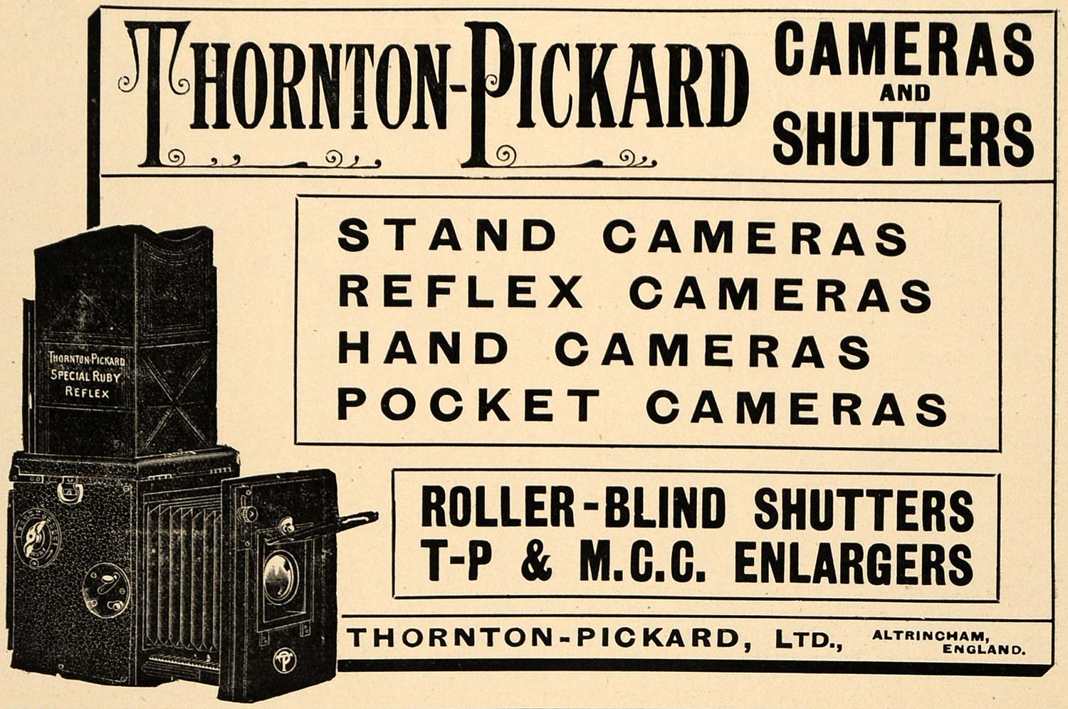 This is an original 1918 black and white print ad for Thornton-Pickard Camera and Shutters from Thornton-Pickard, Ltd., Altrincham, England. Illustrated here is the Special Ruby Reflex Camera.