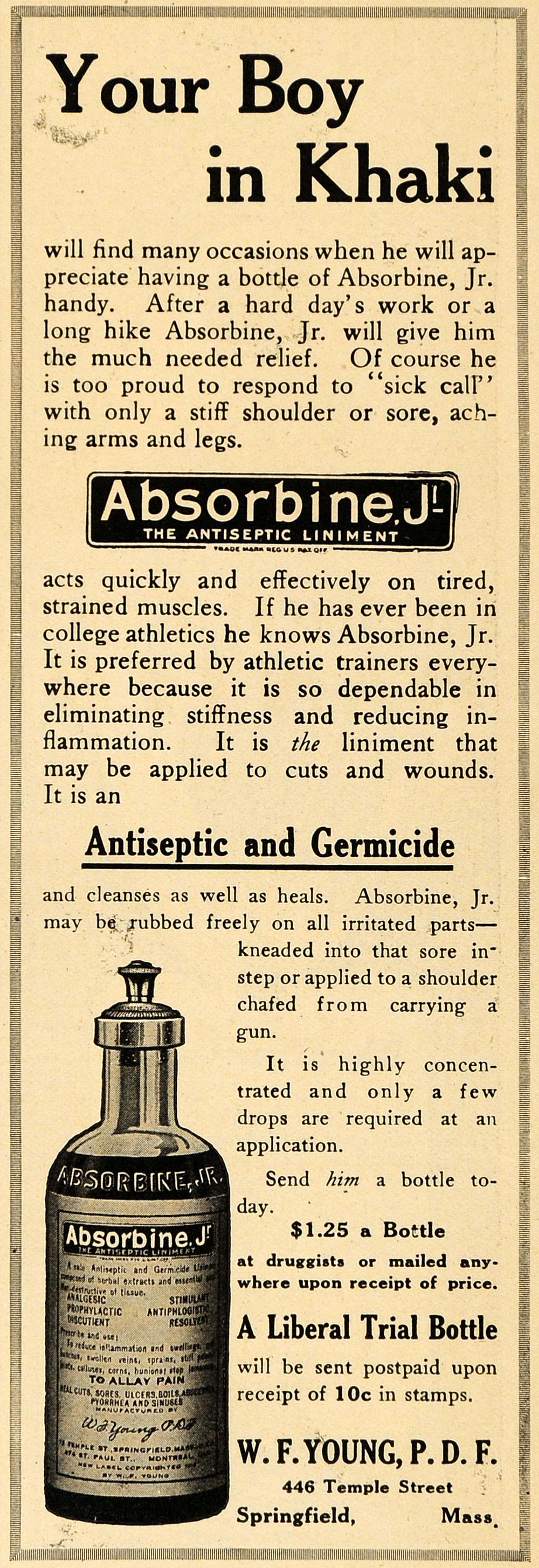 This is an original 1918 black and white print ad for Aborbine J, the Antiseptic Liniment from W. F. Young, located at 446 Temple Street in Springfield, Massachusetts.