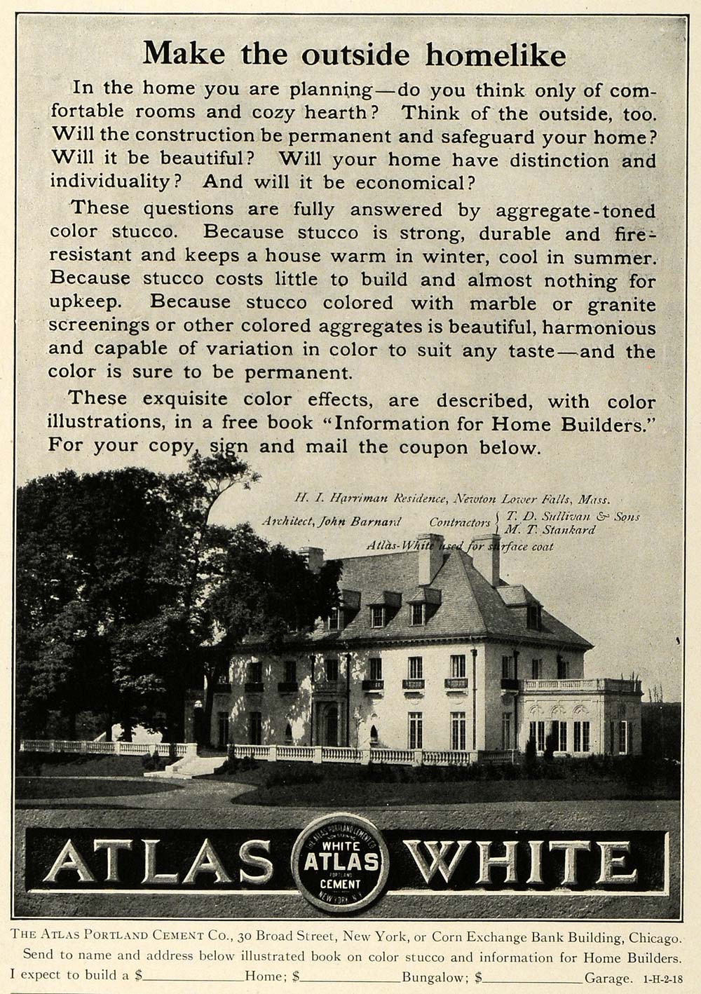 This is an original 1918 black and white print ad for White Atlas Cement, a product by the Atlas Portland Cement Company, located at 30 Broad Street in New York or at the Corn Exchange Bank Building in Chicago. This particular ad features the home of H. I. Harriman in Newton Lower Falls, Massachusetts with architecture by John Banard and contractors T. D. Sullivan & Sons and M. T. Stankard.
