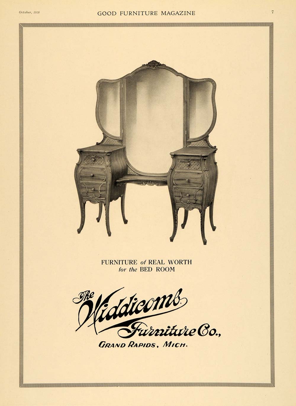 This is an original 1918 black and white print ad for the Widdicomb Furniture Company of Grand Rapids, Michigan. This ad features their bedroom furniture.