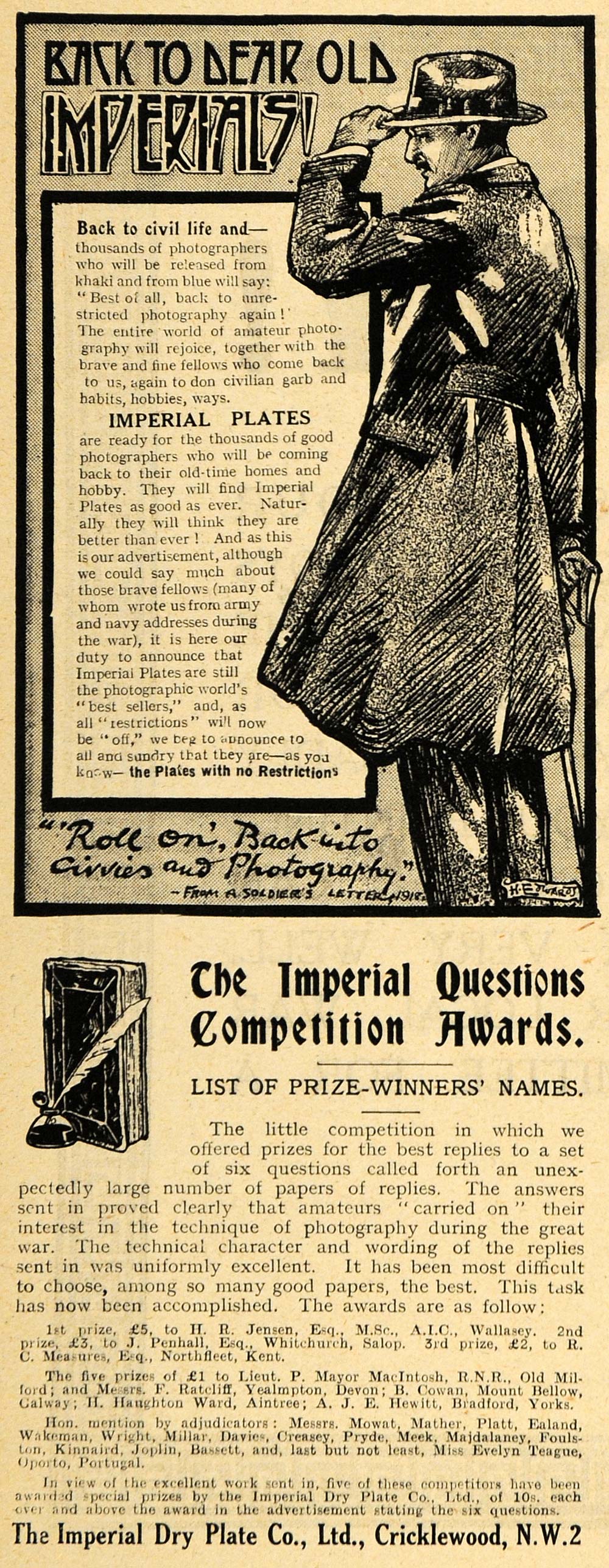 This is an original 1918 black and white print ad for Imperial Plates for amateur photographers returning to civilian life after World War I, from The Imperial Dry Plate Company, Ltd., Cricklewood, London. The ad includes a list of prize winners of a recent Imperial Dry Plate Company contest.