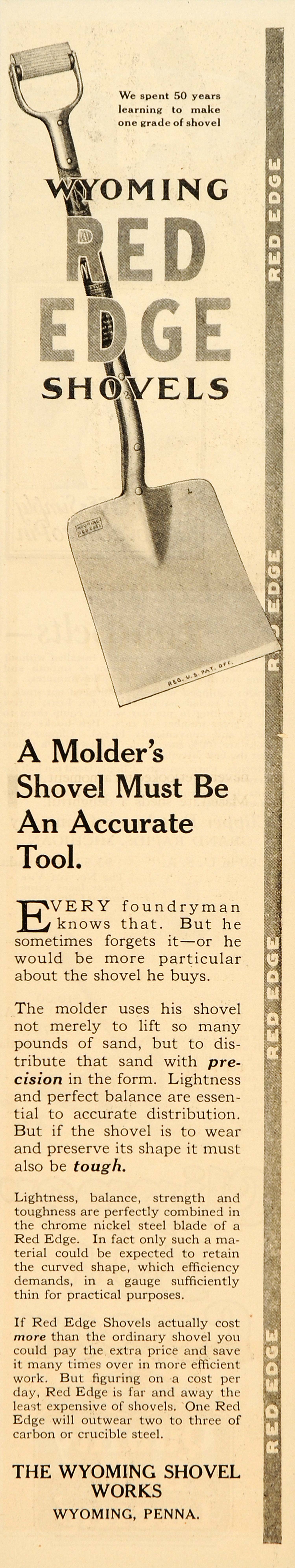 This is an original 1918 black and white print ad for Wyoming Red Edge Shovels. The ad says, "We spent 50 years learning to make one grade of shovel".
