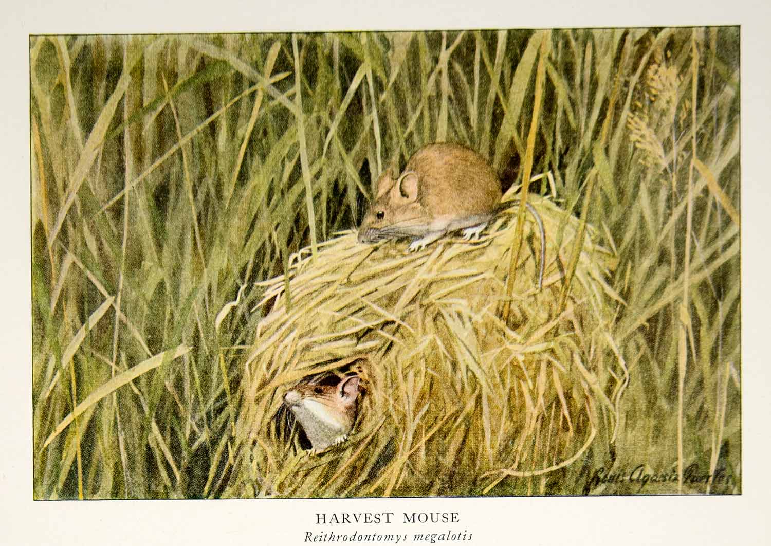 This is an original 1918 color print of a couple Harvest Mice, species Reithrodontomys megalotis, by Louis Agassiz Fuertes.