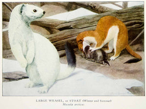 This is an original 1918 color print of a Winter and Summer Stoat, species Mustela Arcticus, by Louis Agassiz Fuertes.