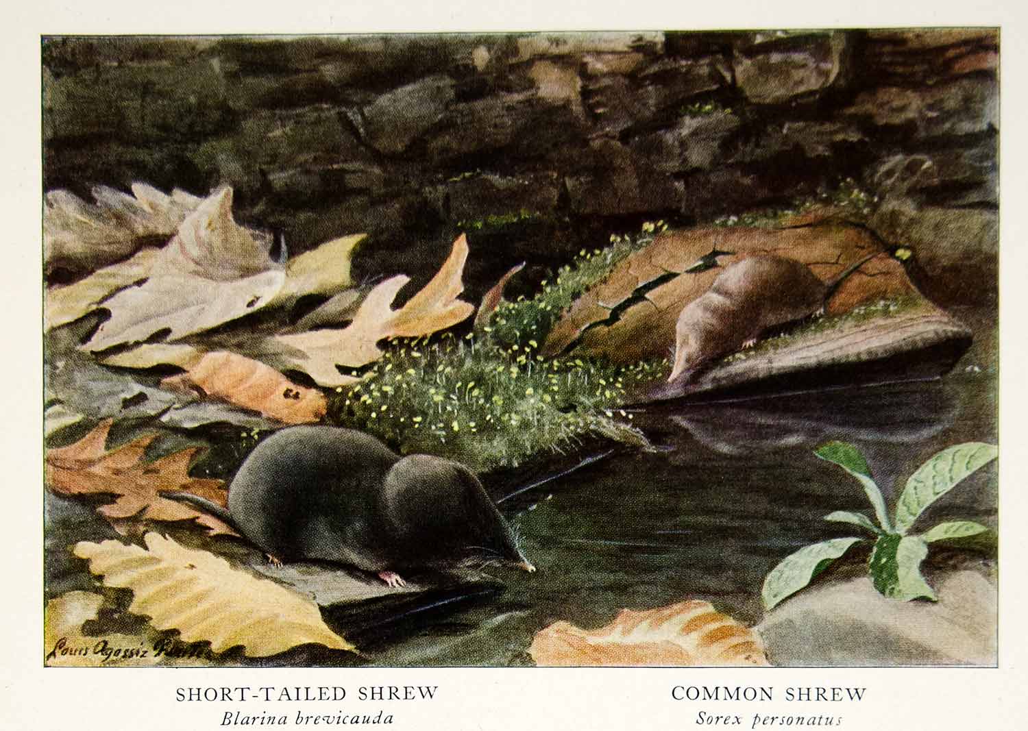 This is an original 1918 color print of a a Short Tailed and Common Shrew, species Blarina Brevicauda and Sorex Personatus, by Louis Agassiz Fuertes.